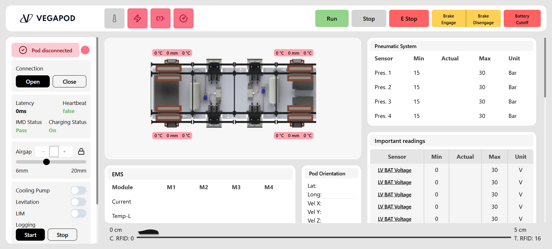 A real-time dashboard and control panel for the Hyperloop prototype, showing live data and helping operators manage tests.